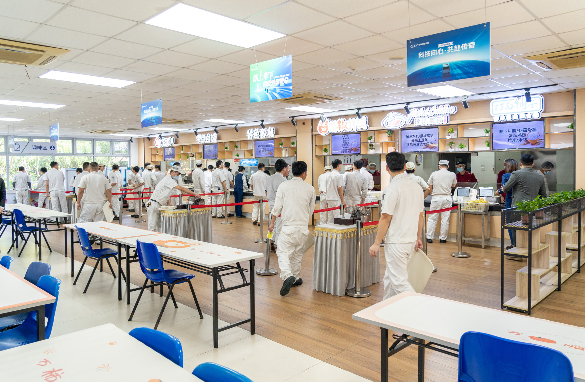 广汽传祺动力总成餐厅现场美食餐线拓展为小型美食广场,依据实地口味调研结果,六大兼顾鲜、咸、辣多种国内外风味的美食档口上线。